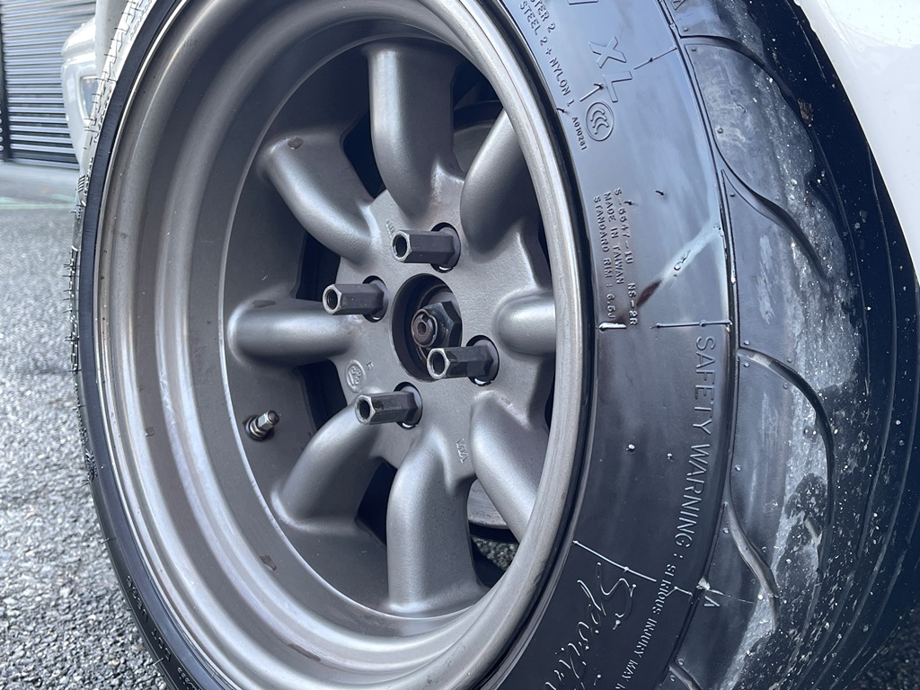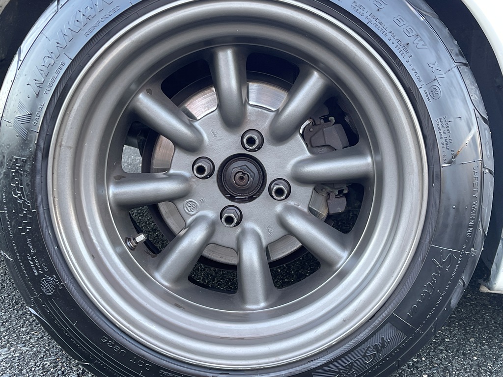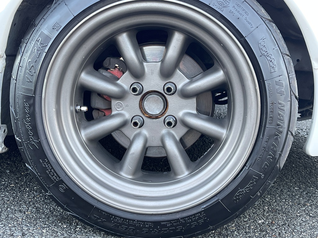 通常ロードスターには履かせるのが困難なRサイズのワタナベですが3ナンバーオーバーフェンダー仕様で収まりヨシです。