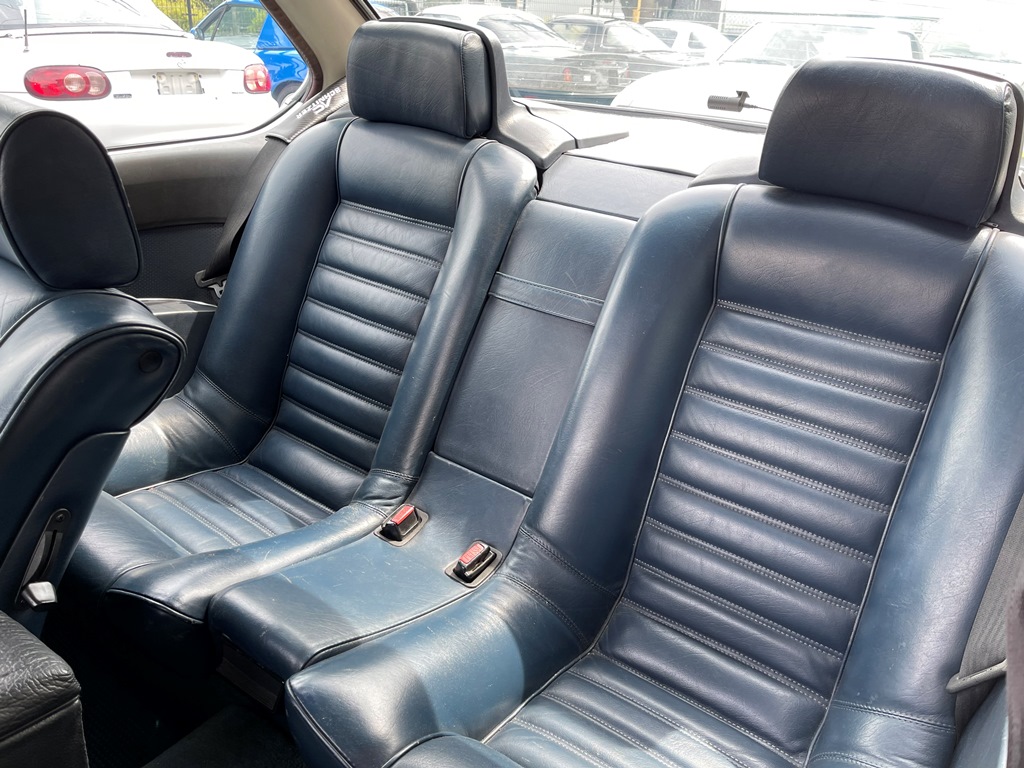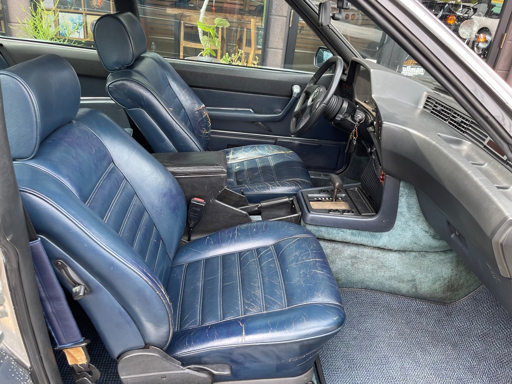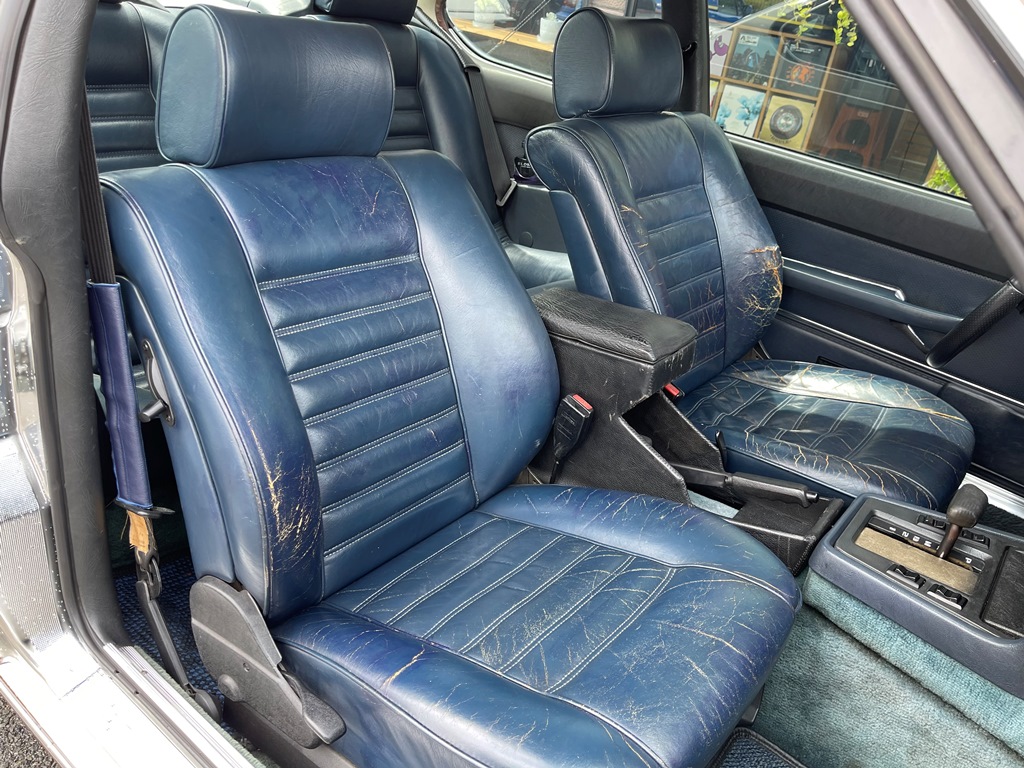 オリジナルブルーレザーシート。運転席は経年により少々ダメージがありますが、これも味の一つ。もちろんリフレッシュ張替えご相談ください。